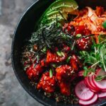 The Teriyaki Tofu Bowl is a complete dish that highlights the subtle balance between Japanese flavors and fresh vegetables. The seasoned rice provides a soft and slightly tangy base, ideal for welcoming tofu glazed with a homemade teriyaki sauce. This combination creates a harmonious blend of simplicity and indulgence.