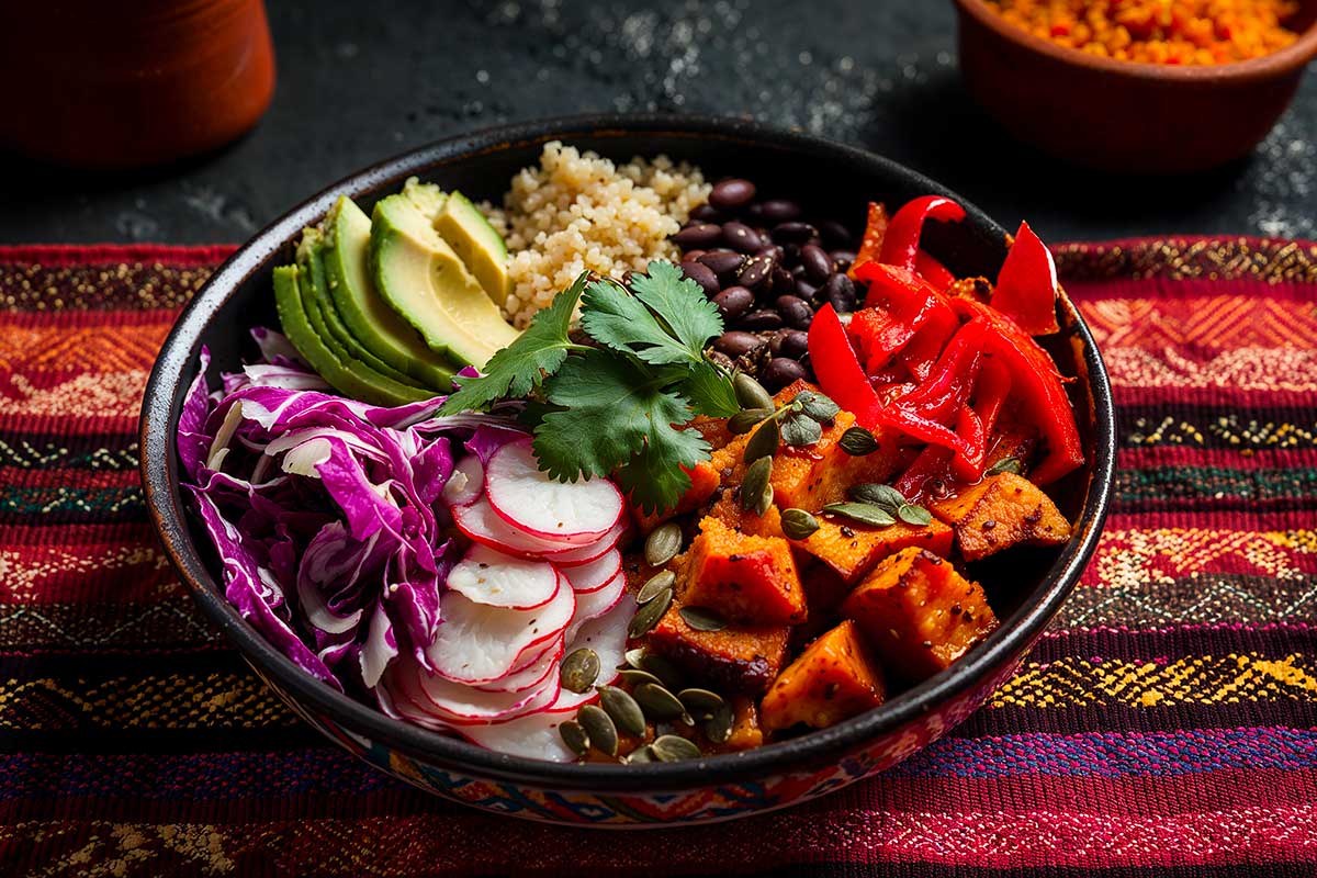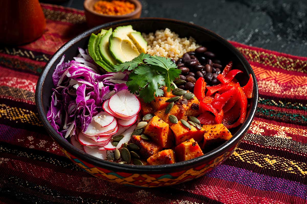 The Aztec Bowl is inspired by the plant-based culinary traditions of Central America, especially Mexico, where vibrant colours, varied textures, and bold flavours come together in a dish that is as beautiful as it is nourishing. This bowl celebrates the richness of the earth: roasted vegetables, seasoned beans, crisp raw veggies, and a creamy sauce that ties everything together.