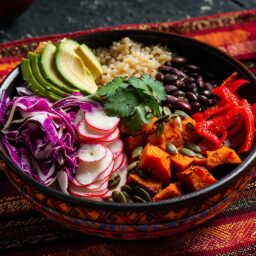 At the heart of the recipe, quinoa provides a light and wholesome base, enriched by spiced black beans, tender roasted sweet potato, and red bell pepper. The addition of red cabbage, radishes, and avocado brings colour and texture, balancing freshness, crunch, and creaminess. It’s a warm-cold combination that highlights the abundance of plant-based foods.