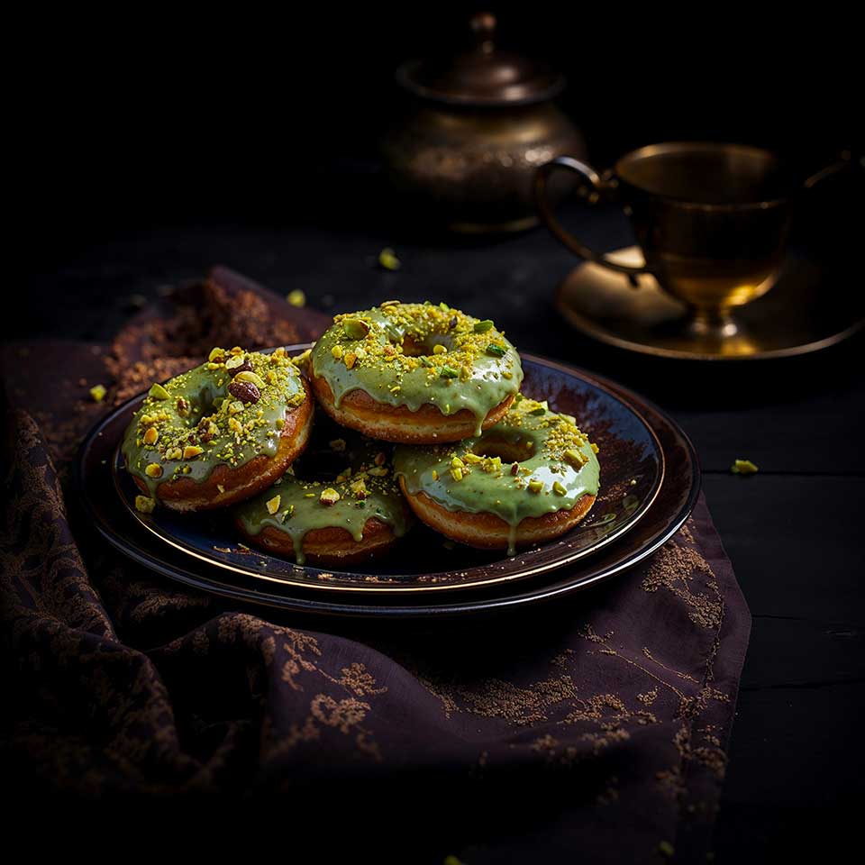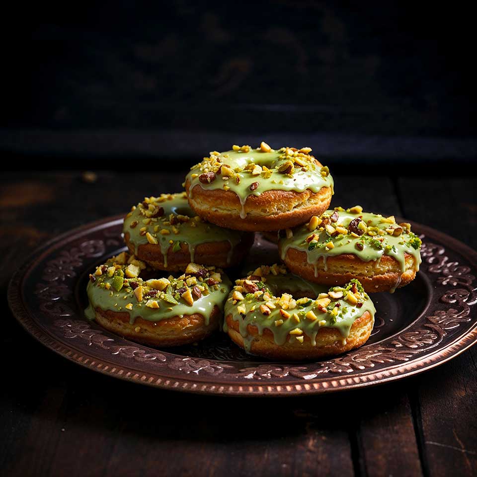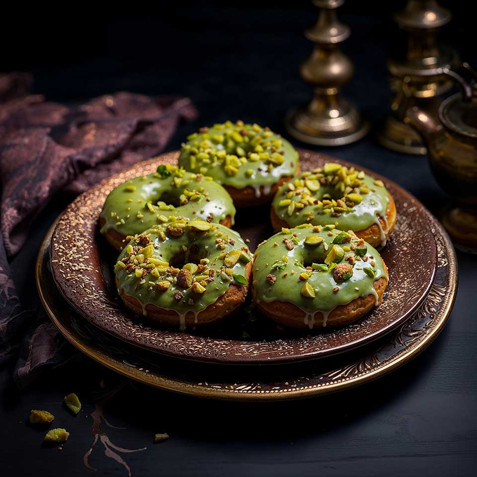 In this recipe, we will incorporate this one-of-a-kind powder to create baked donuts, accompanied by a matcha glaze and decorated with crushed pistachios. A true fusion of indulgence and tradition that will delight your taste buds!