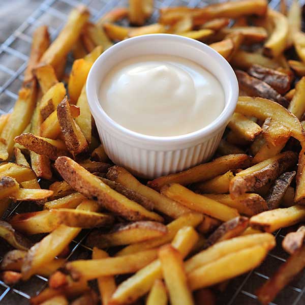 This mayonnaise can serve as a basis for dozens of variations as you can add whatever you want: garlic, for example, or other herbs and spices (curry, paprika…).