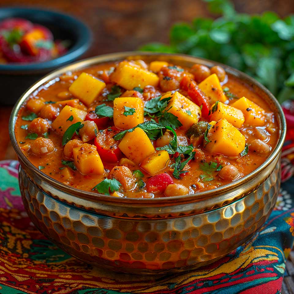 Spicy Mango Curry is a vibrant and flavorful dish that combines the sweetness of ripe mangoes with the heat of Indian spices. This vegan curry, rich in colors and textures, is perfect for bringing an exotic and comforting touch to your table. Easy to prepare, it’s ideal for a weeknight dinner or to impress your guests at a festive meal.