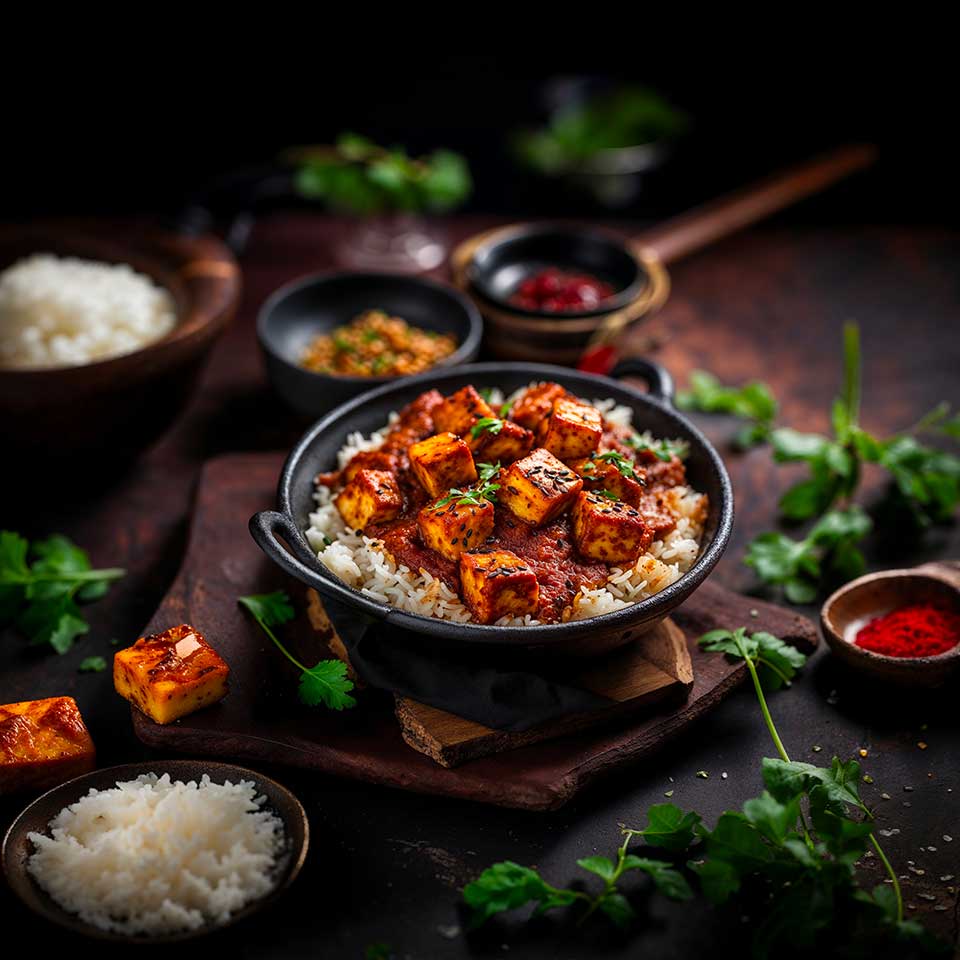 The preparation of this Gourmet version is quite straightforward: it all starts with preparing the spices and aromatics. The tofu then needs to marinate for at least 1 to 2 hours before being grilled until golden and crispy. It is then incorporated into a rich and creamy sauce made from coconut milk and tomatoes, enhanced by a blend of spices such as turmeric, cumin, coriander, and Garam Masala.