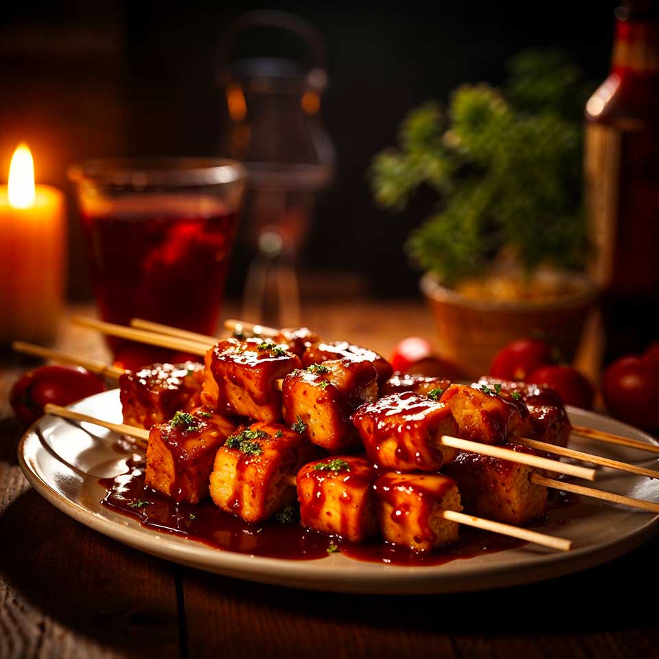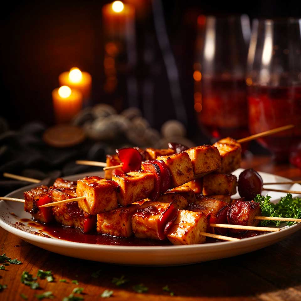 Awaken your taste buds with Maison Marmite‘s sublime Tofu Skewers with Cardinal Sauce, a creation that honors the art of French culinary tradition. Inspired by the richness of traditional flavors and the finesse of French cuisine, this recipe transforms tofu, a humble ingredient, into a star of gastronomy. Each bite is a celebration of textures and tastes, where firm tofu meets the sweetness of bell peppers and the creaminess of mushrooms, all enhanced by a daring and delicately spiced red wine sauce. This sauce, named “Cardinal” in homage to Claudia Cardinale, the celebrated actress and animal rights advocate, wraps the skewers in a rich and fragrant robe that will seduce even the most demanding palates.