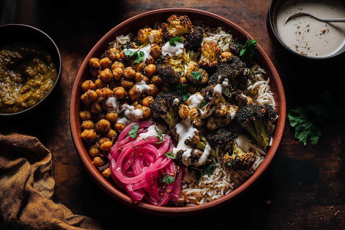 - Ajoutez les brocolis tikka, les pois chiches croustillants, un peu de pickles d’oignons rouges et une cuillerée de chutney de mangue.