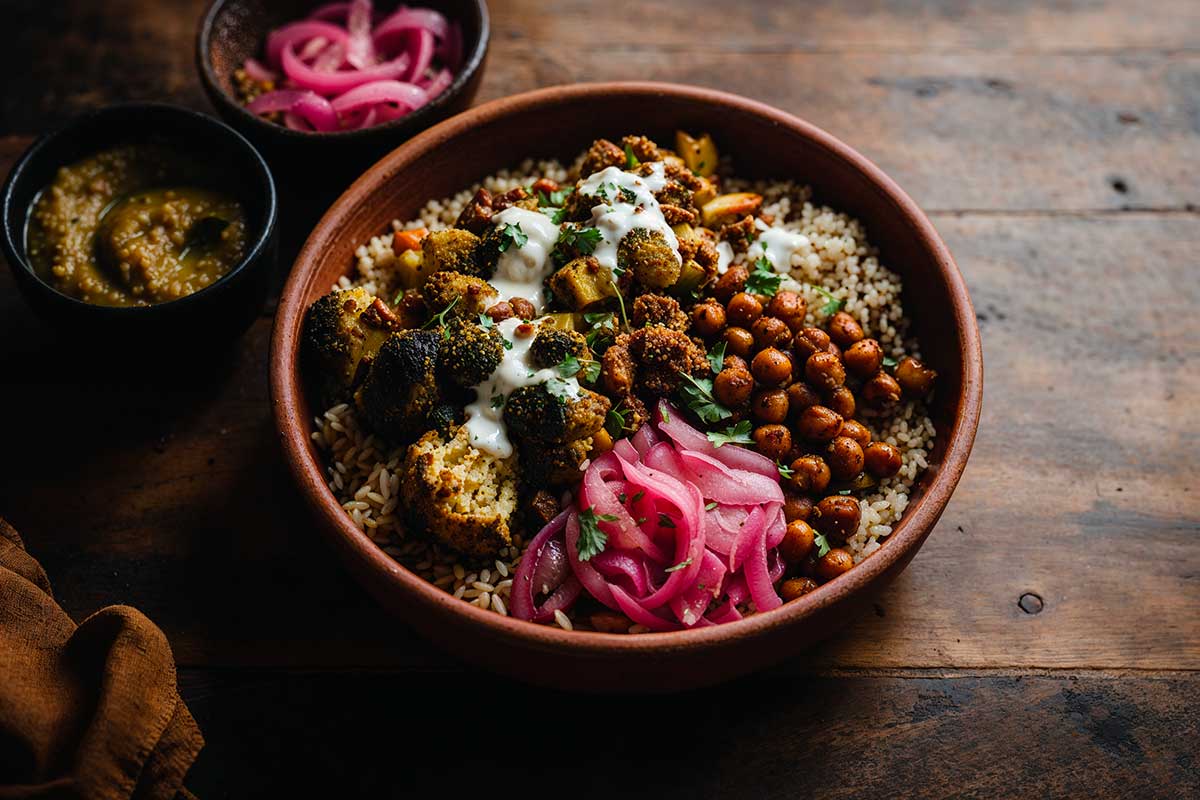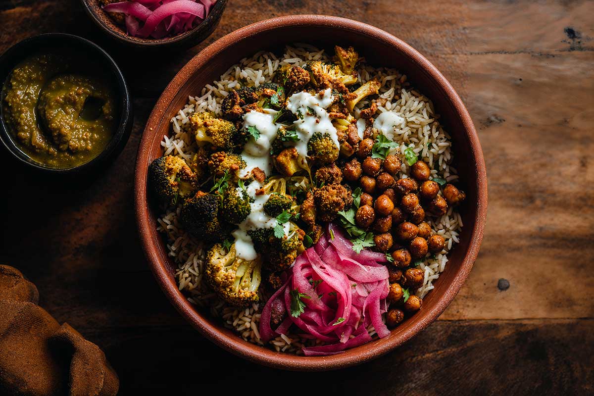 La finition est assurée par une sauce yaourt-coriandre onctueuse, à la fois fraîche et parfumée, ainsi qu’un peu de coriandre supplémentaire pour la vivacité. Ce bowl complet conjugue croquant, crémeux, douceur et intensité, pour une assiette colorée, nourrissante et profondément inspirée de l’esprit chaleureux de la cuisine indienne.