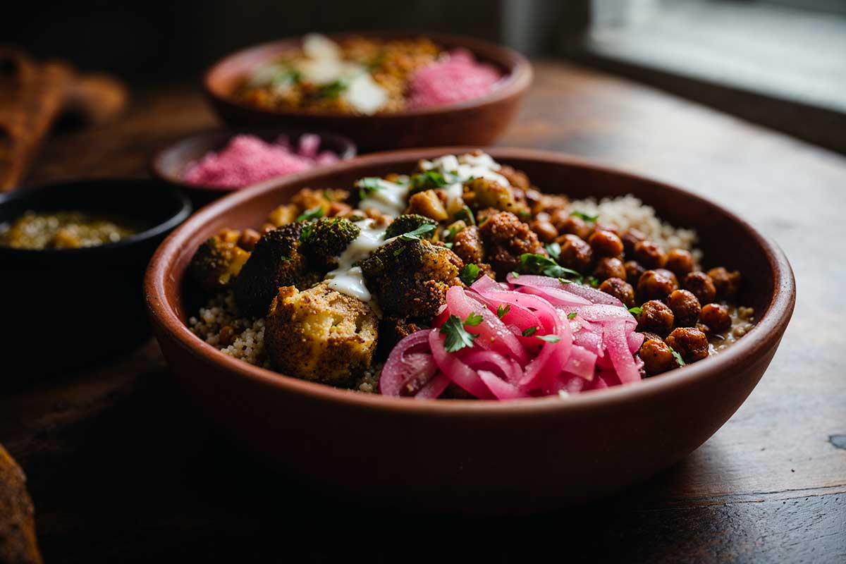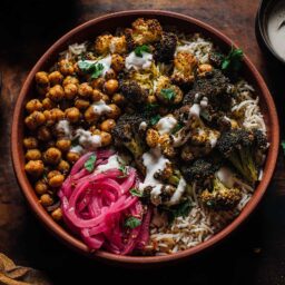 Les pois chiches croustillants sont assaisonnés de cumin, coriandre et paprika fumé, puis cuits soit au four pour une texture sèche et croquante, soit à la poêle pour un résultat plus doré et rapide. À leurs côtés, des brocolis rôtis façon tikka, enrobés de yaourt végétal et de pâte de curry, apportent une intensité épicée et une belle gourmandise. Ce duo crée un équilibre parfait entre croustillant, fondant et épices chaudes.