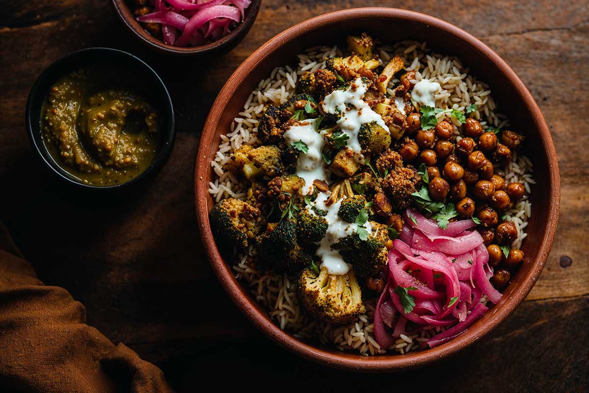 Le Bombay Bliss Bowl s’inspire des saveurs indiennes et réunit dans un seul plat un mélange généreux de textures et d’arômes. À la base, un riz basmati parfumé aux graines de cumin apporte une douceur légère et un parfum subtil qui se marie à merveille avec les préparations épicées. Ce socle moelleux et parfumé met en valeur les contrastes du reste du bowl.