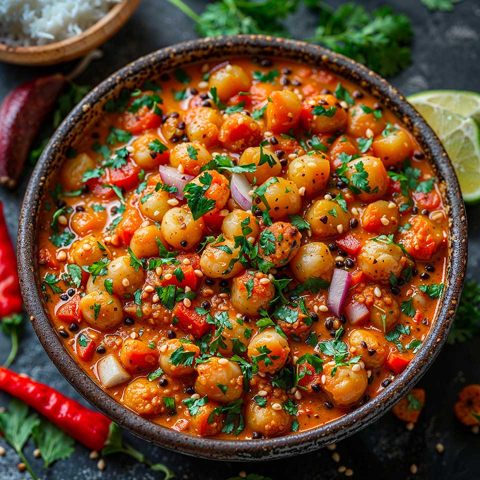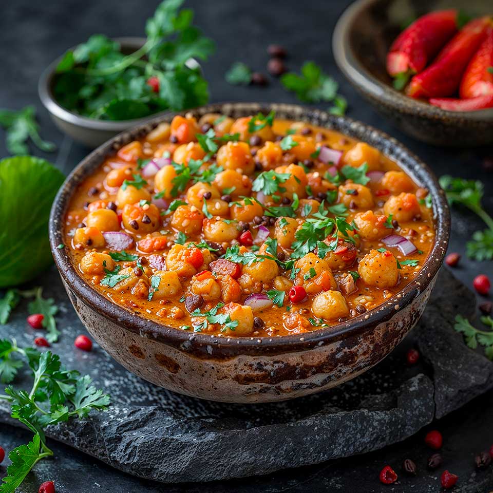 Plat par excellence du nord de l’Inde, avec autant de variantes qu’il n’y a de cuisiniers, le Chana Masala est un plat succulent et copieux qui peut même être adapté pour nourrir une foule. Ce curry de pois chiche est un incontournable de la cuisine indienne.