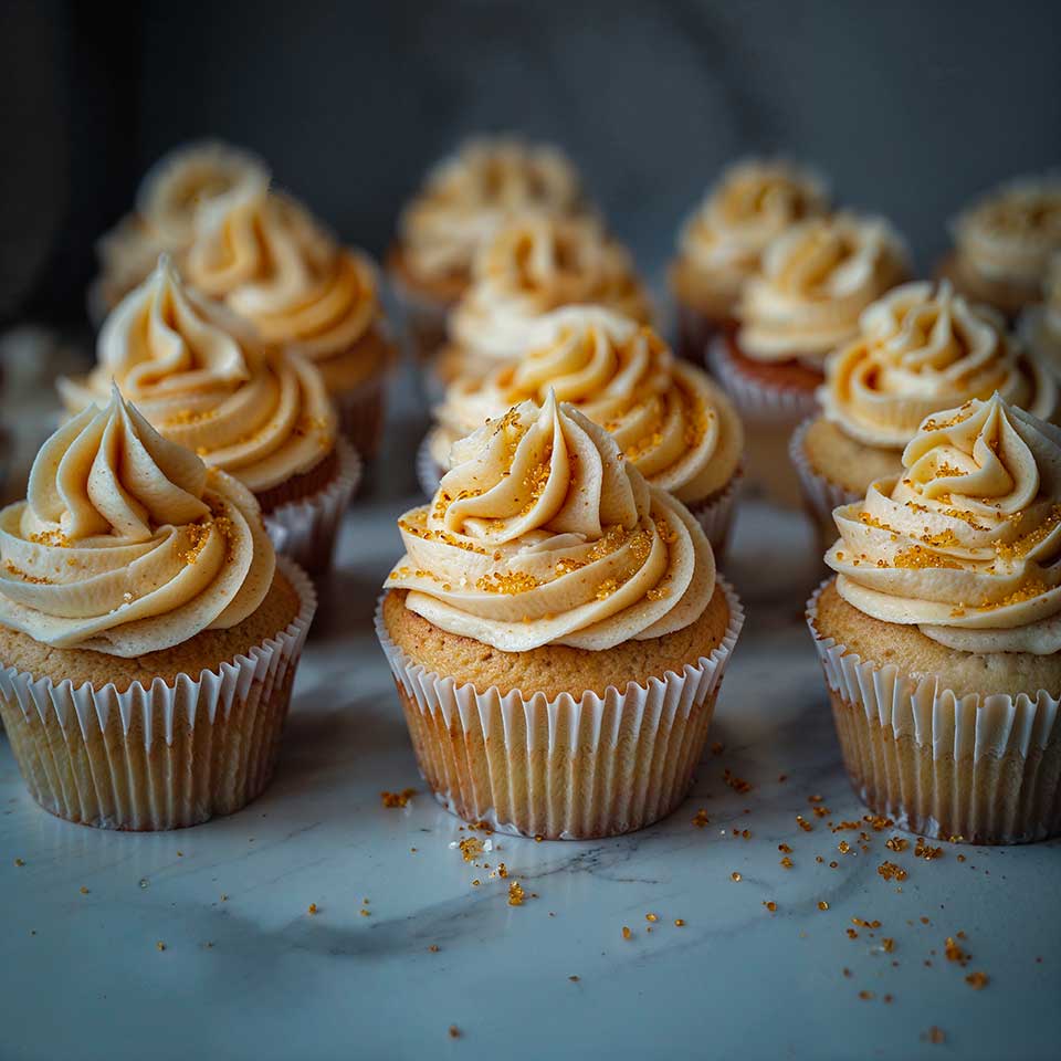 - Une fois les cupcakes complètement refroidis, utilisez une poche à douille pour appliquer le glaçage jaune citron/orange sur chaque cupcake.