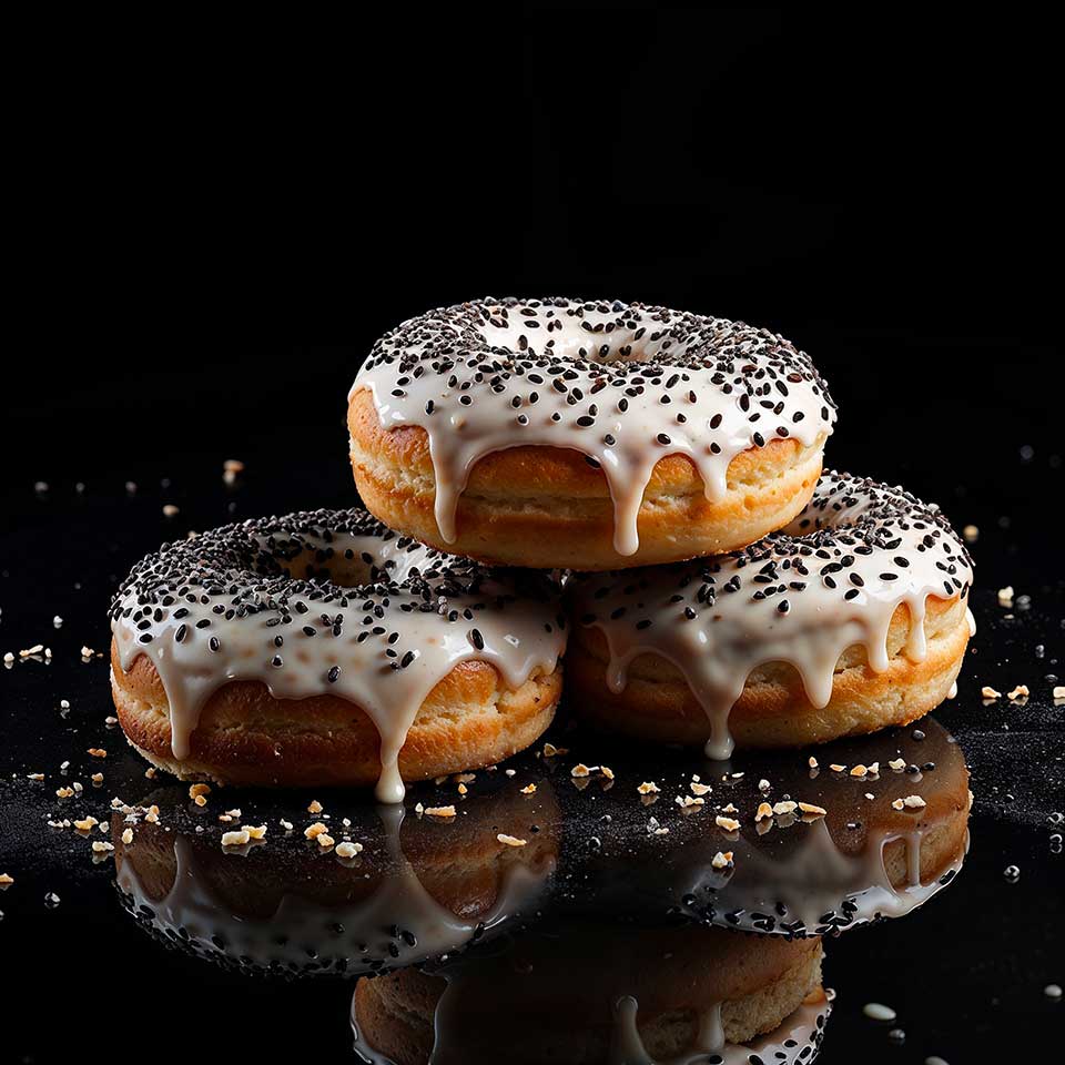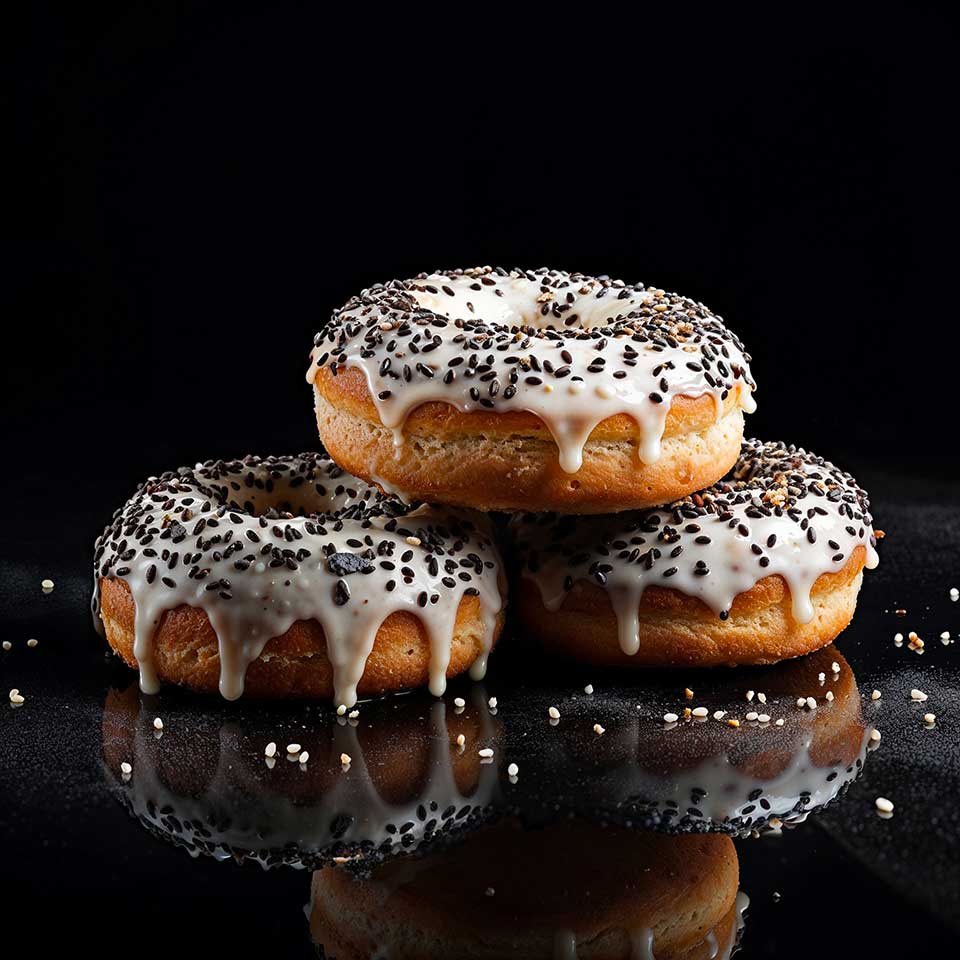 Le glaçage, une fusion subtile de sucre glace et de graines de sésame noir, est la touche finale qui transforme chaque donut en une pièce maîtresse. Embarquez donc dans cette aventure culinaire où la vanille rencontre le sésame noir — une rencontre destinée à devenir un classique!