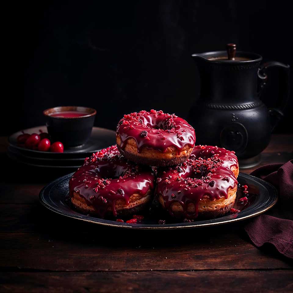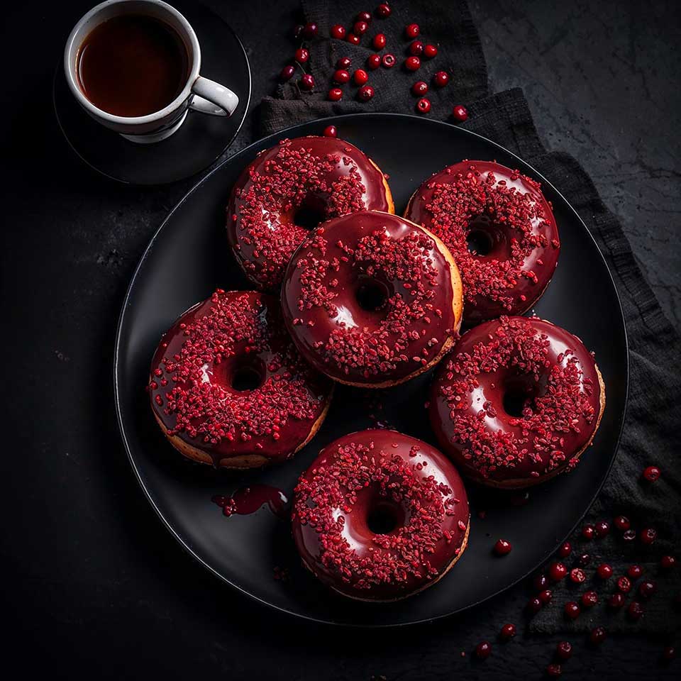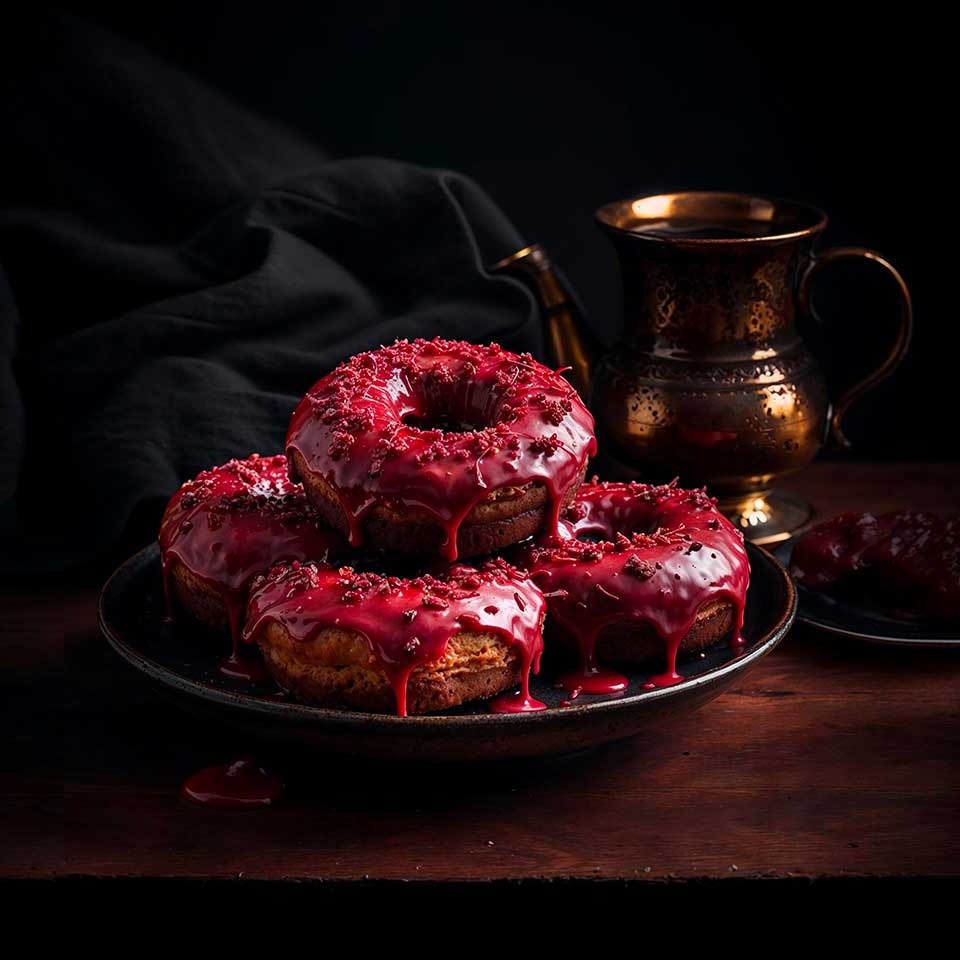 Le secret de la couleur éclatante de ce donut réside dans son glaçage unique, préparé avec de la poudre de betterave rouge, un ingrédient naturel qui offre non seulement une couleur rouge profonde mais aussi une douceur subtile et terreuse. Cette fusion de saveurs est un hommage à la sophistication et au raffinement de la cuisine impériale.