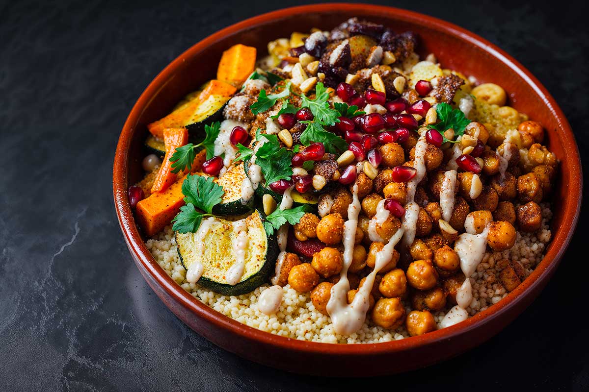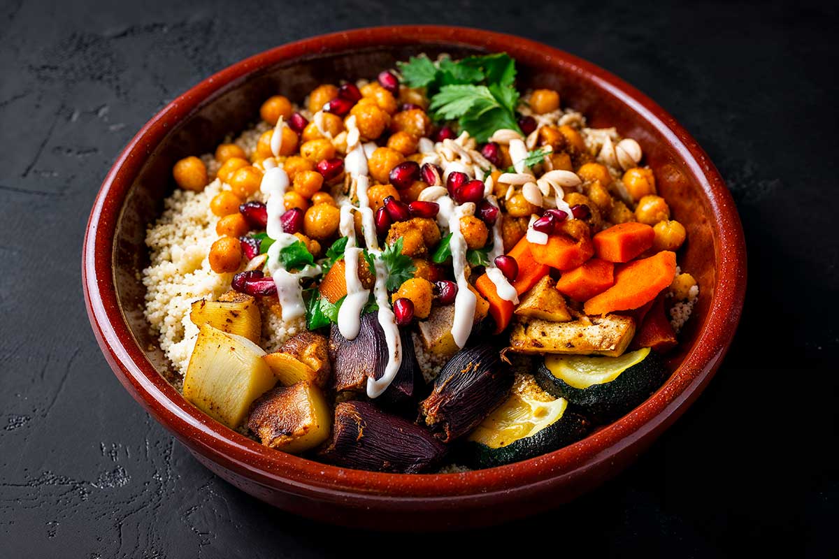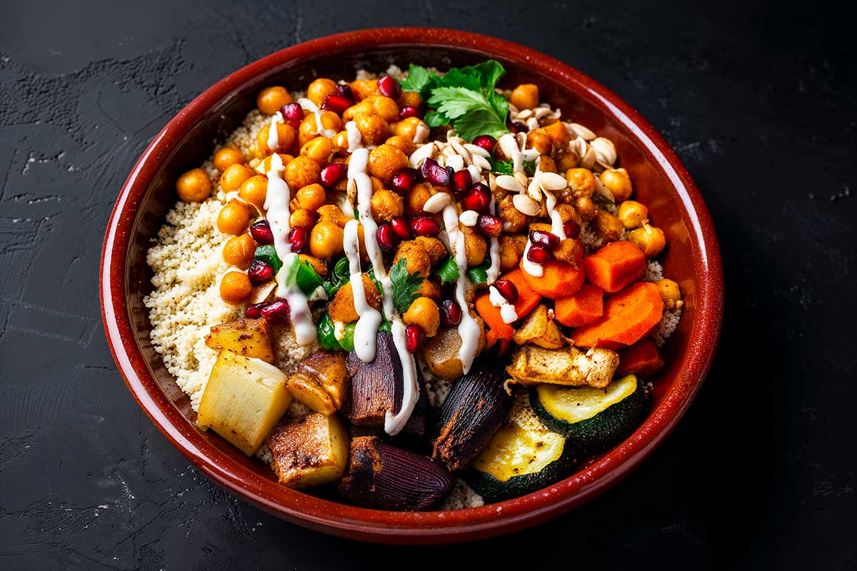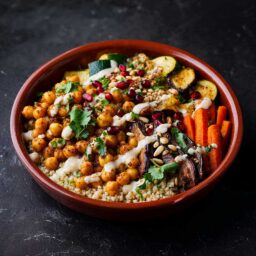 La touche finale est assurée par des graines de grenade éclatantes, des pignons grillés et quelques feuilles de coriandre fraîche. Une petite poignée de roquette ou de jeunes pousses ajoute encore plus de fraîcheur et de contraste. Le résultat est un bowl complet, nourrissant et raffiné, qui capture l’esprit chaleureux et convivial de la cuisine marocaine contemporaine.