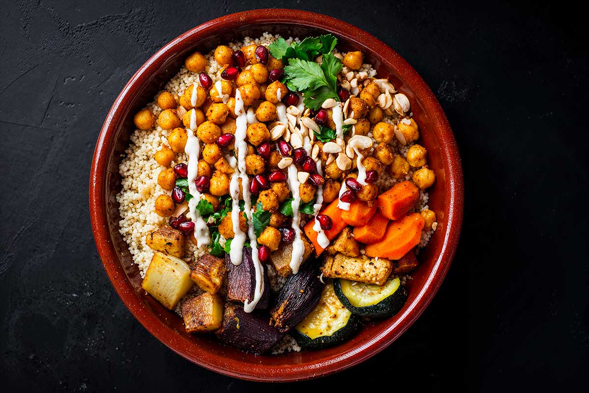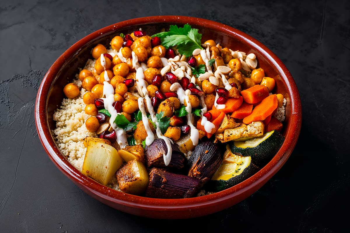 Le Moroccan Spice Bowl est une invitation au voyage culinaire, inspirée des saveurs chaudes et parfumées du Maghreb. À la base, un couscous perlé ou du boulgour légèrement citronné apporte une texture moelleuse et acidulée, qui sert de socle aux différentes préparations. Cette simplicité volontaire met en valeur la richesse des épices et l’équilibre des saveurs.
