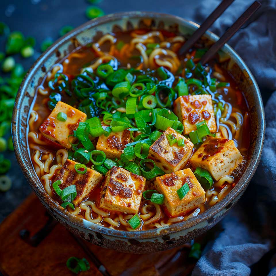 Notre recette de Ramen aux Shiitakes commence par la préparation d’un bouillon umami riche, utilisant des champignons shiitake et du miso comme base principale pour un goût profond et riche. Le tofu doré et un assortiment de légumes frais ajoutent texture et couleur au plat, rendant chaque bouchée à la fois saine et savoureuse. Le processus est simple: on commence par le bouillon et pendant qu’il mijote, on fait dorer le tofu et les légumes dans une poêle ; on les rajoute au bouillon, ainsi que les nouilles. Le tout est servi chaud, garni d’oignons verts pour une touche finale fraîche et croquante.