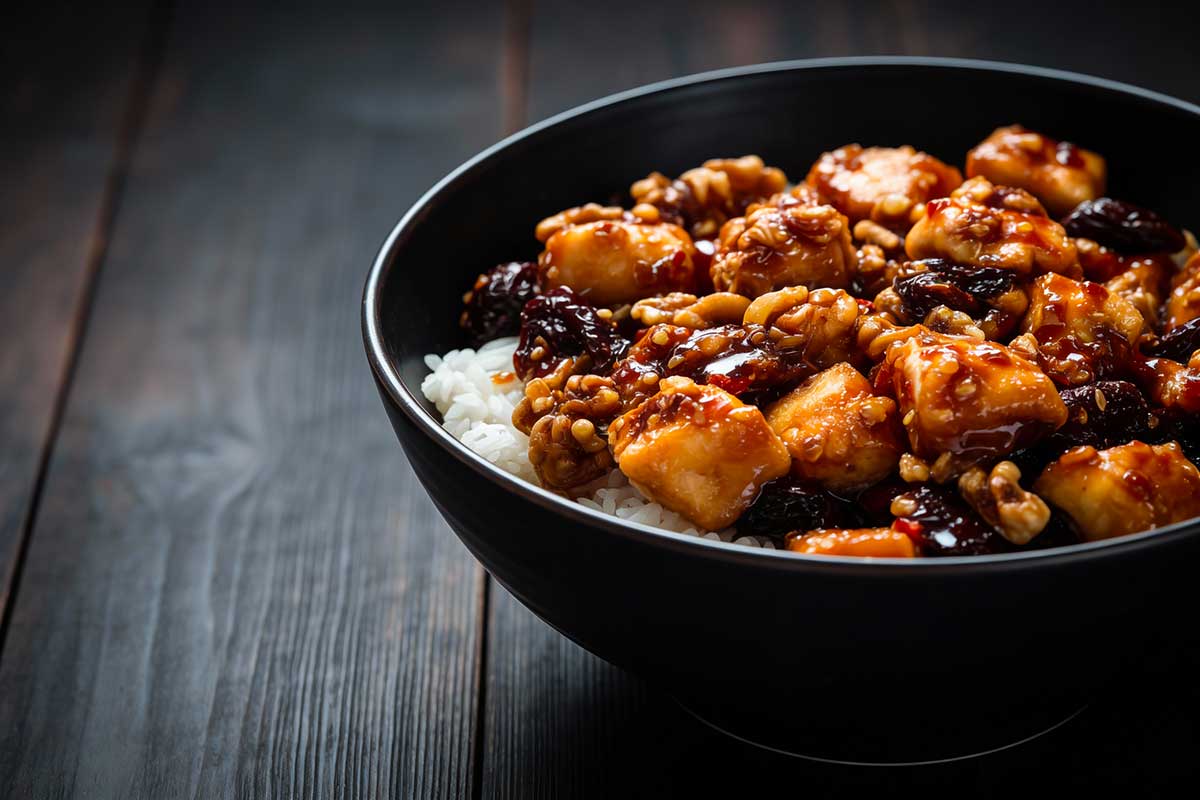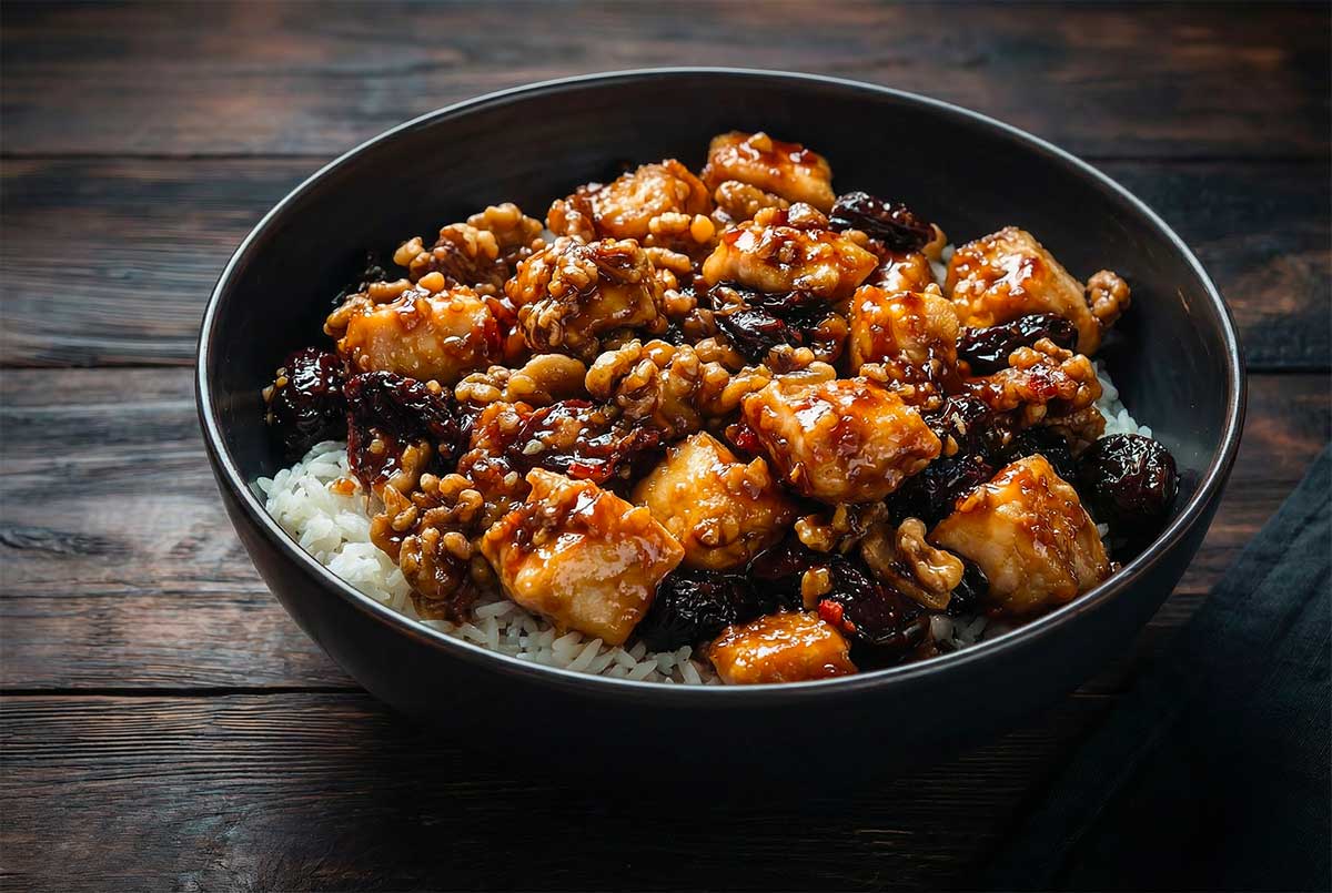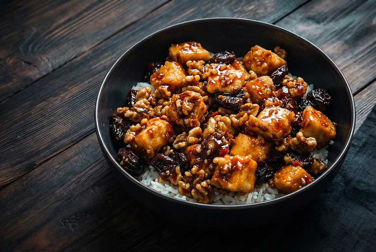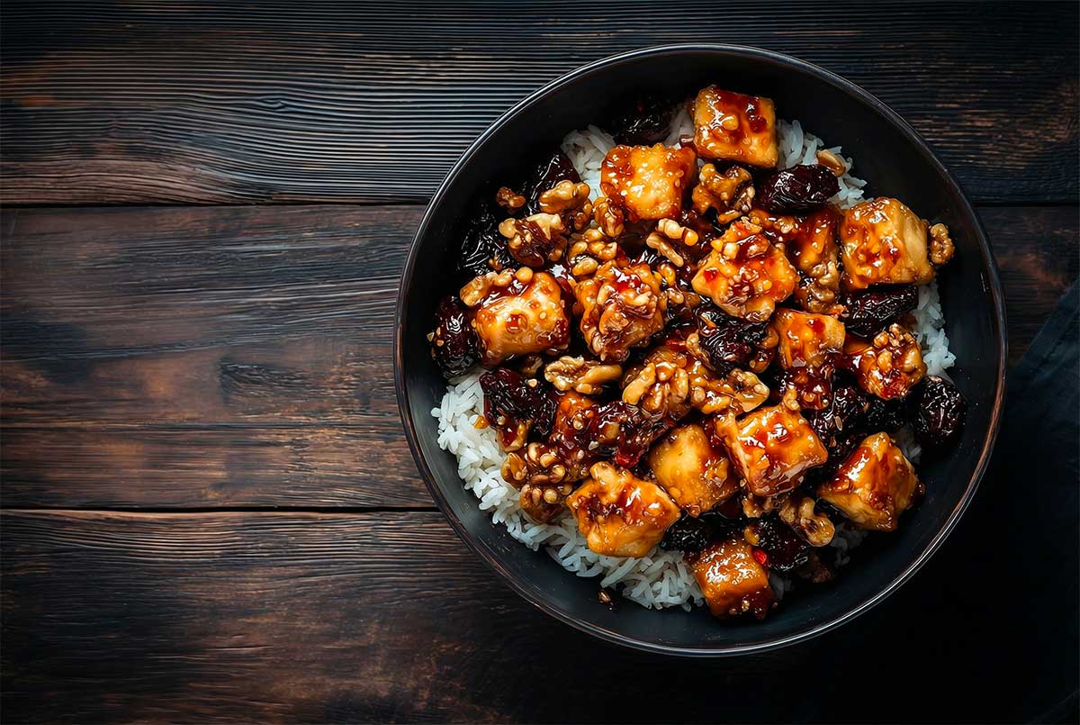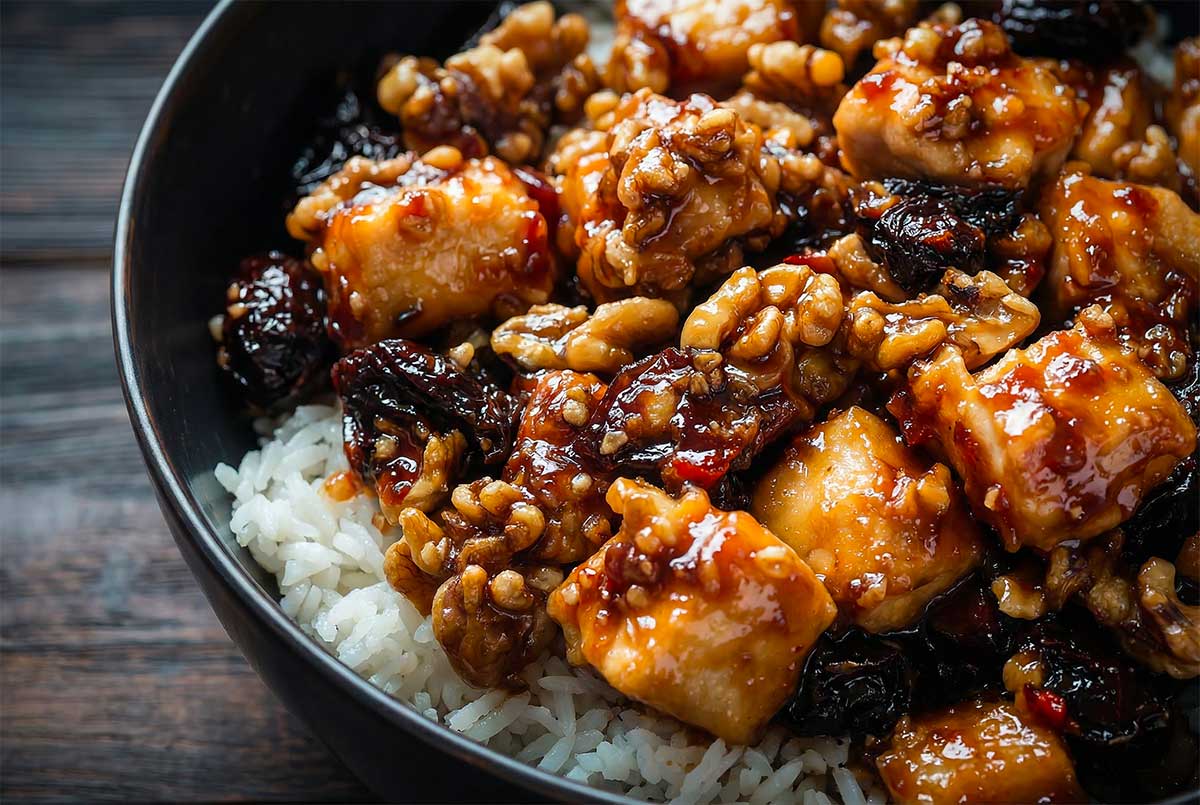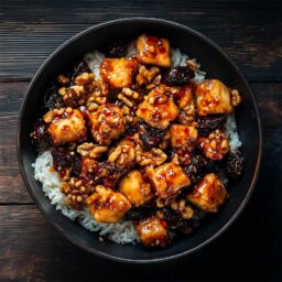 Tout se joue aussi dans les textures: tofu crousti-moelleux, pruneaux fondants, noix croquantes, le trio fait le travail. Si vos pruneaux sont un peu secs, il suffit de les réveiller 10 minutes dans de l’eau chaude ou un thé fumé, et le tour est joué. Et le gingembre, lui, n’est pas là pour décorer, il apporte le peps et la fraîcheur qui empêchent le plat de devenir écœurant, surtout avec le côté généreux du sucré-salé.