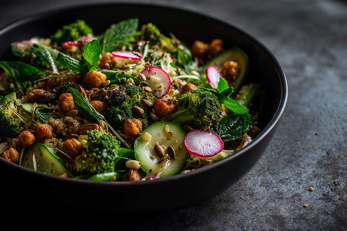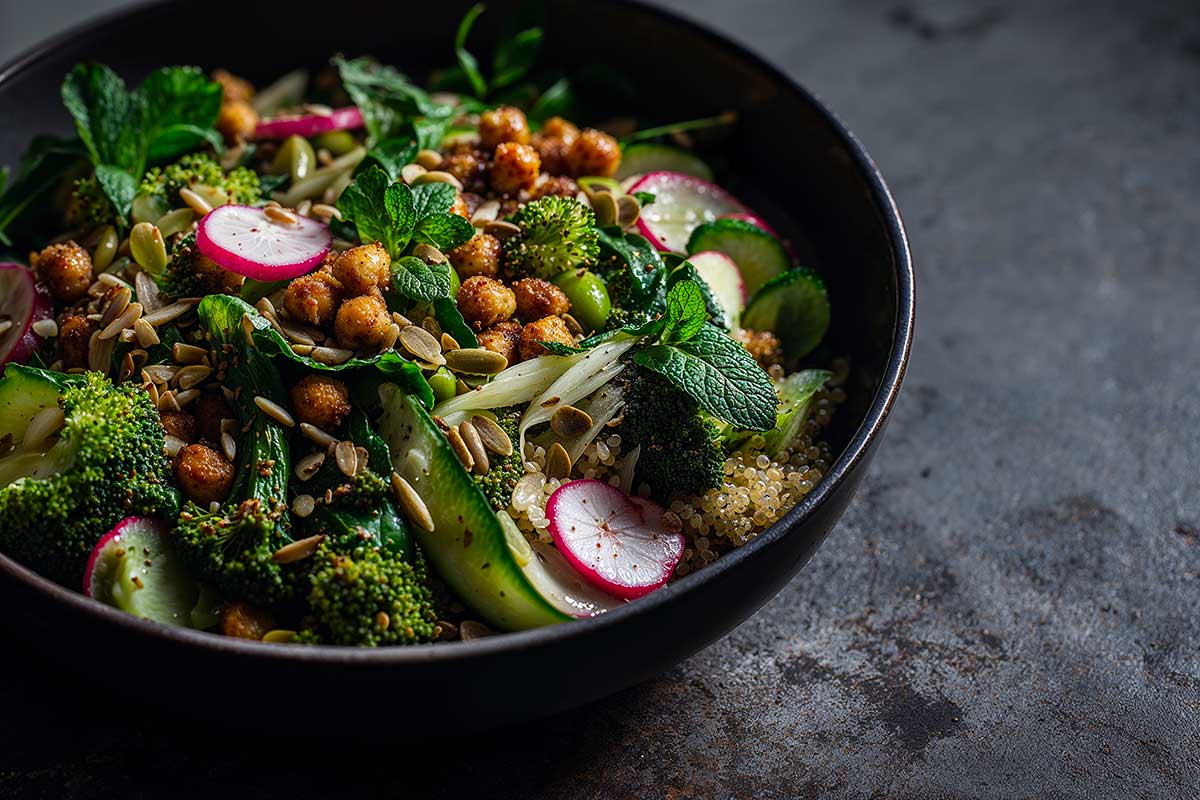 À la base, un quinoa moelleux et chaud accueille des brocolis tendres, du fenouil émincé, des radis et de la courgette crue, pour une alternance subtile entre douceur et mordant. Les pois chiches croustillants, rôtis à la poêle avec du paprika, viennent ajouter une note chaude et rassasiante, tout en offrant une belle touche de protéine végétale.
