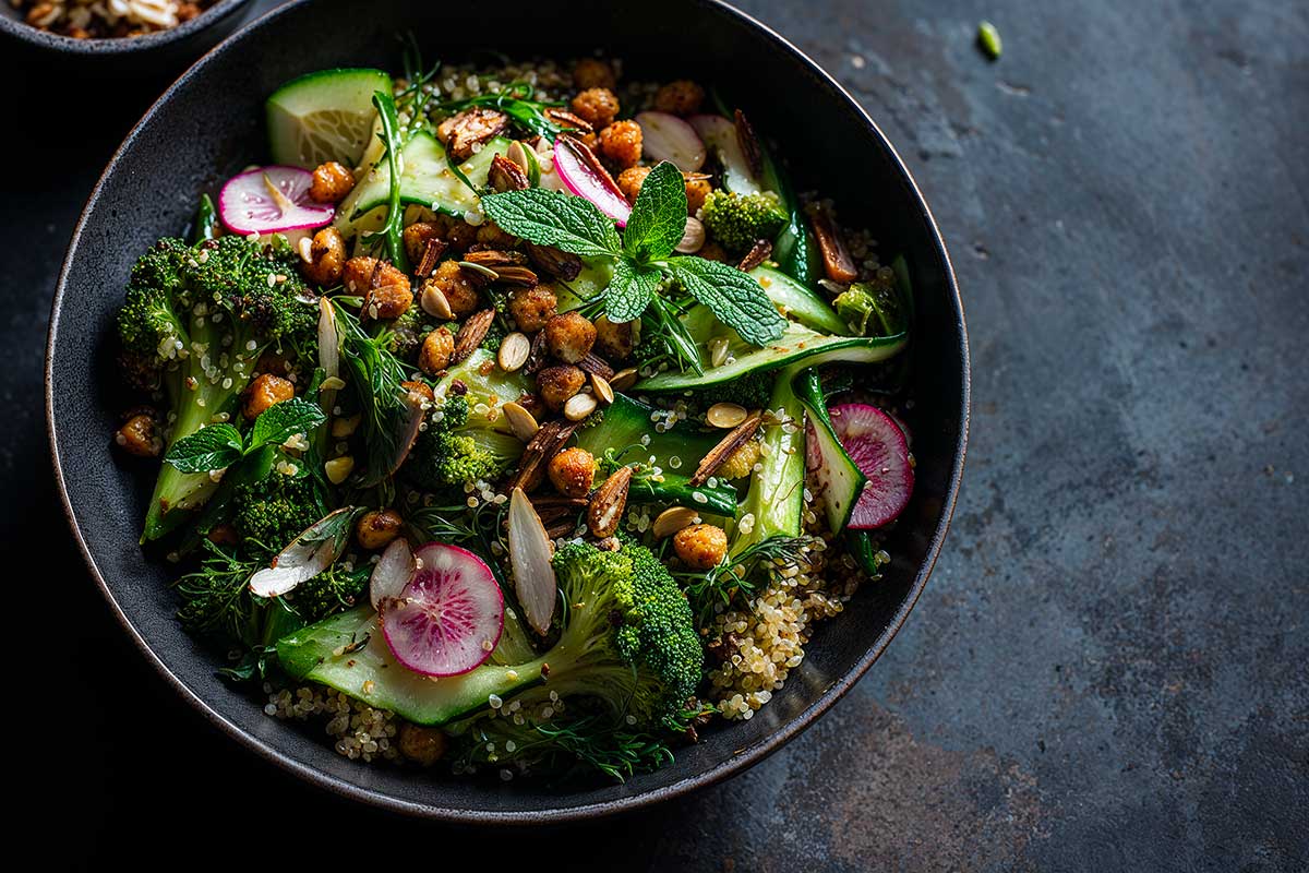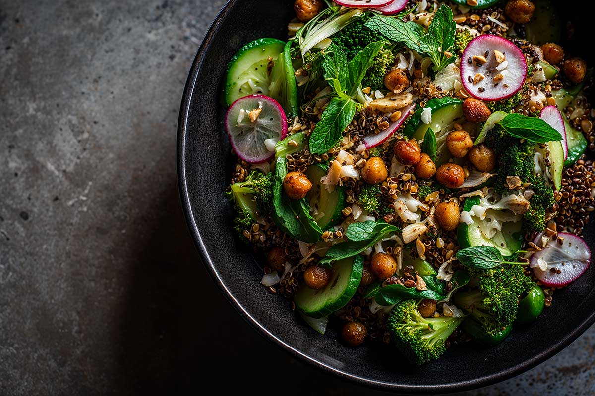 • Répartissez le quinoa dans deux bols. Disposez autour les brocolis, la courgette, le fenouil, les radis, les jeunes pousses et les feuilles de menthe.