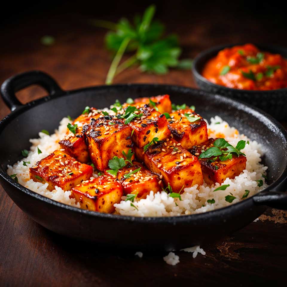 - Servez le Tofu Tandoori avec Sauce Tikka Masala chaud, garni de feuilles de coriandre et accompagné de riz ou de pain naan.