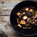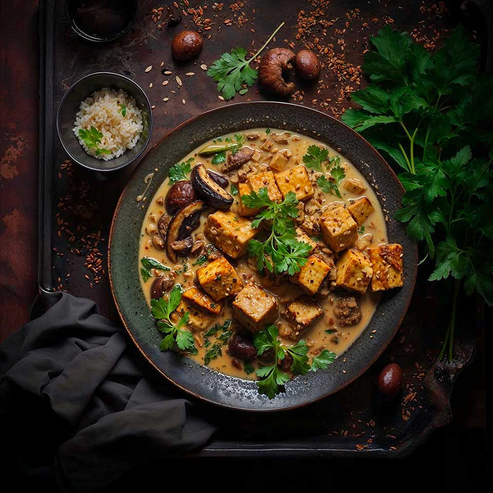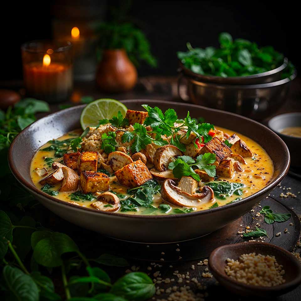 En résumé, notre recette débute par une marinade du tofu dans un mélange de sauce soja, sirop d’agave et ail en poudre, ce qui lui apporte une profondeur de goût. Après 30 minutes de marinade, le tofu est sauté dans une poêle jusqu’à ce qu’il soit doré. Dans la même poêle, nous faisons revenir l’ail, le gingembre, les graines de cumin, de coriandre, de curcuma, de moutarde et de fenouil pour libérer leurs arômes, suivis de la pâte de curry. Après une minute, les champignons et le poivron rouge sont ajoutés et brièvement cuits. Le plat est ensuite complété par le lait de coco et le zeste de citron vert, créant une sauce onctueuse dans laquelle le tofu doré continue de mijoter pendant quelques minutes. En moins de 30 minutes hors marinade, ce plat exotique et savoureux sera prêt à déguster.