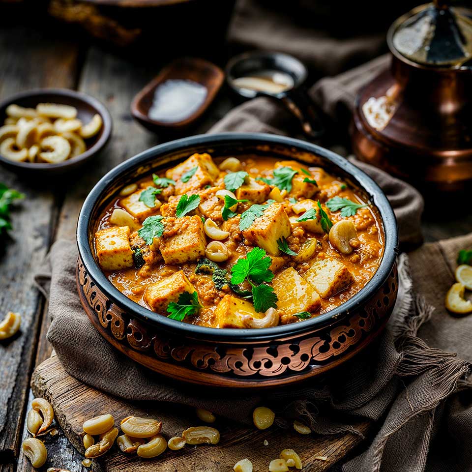 - Servez chaud, garni de coriandre fraîche et de noix de cajou grillées, accompagné de riz basmati ou de naans.