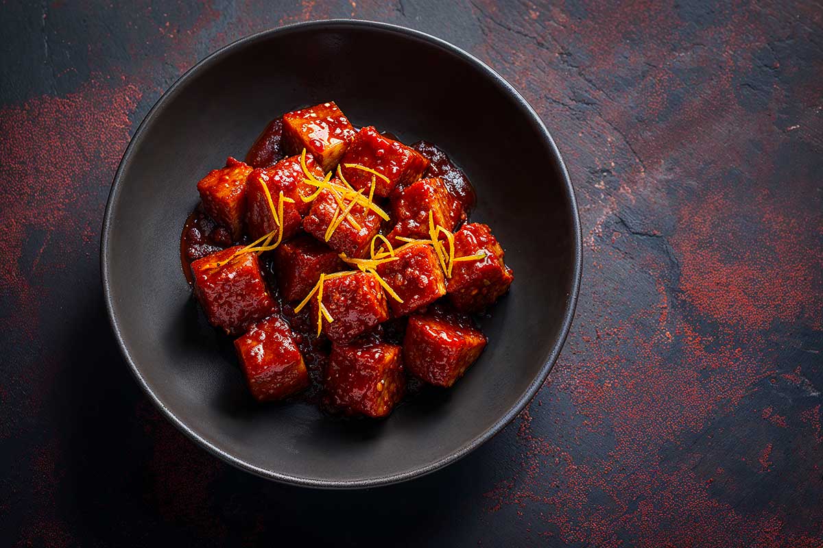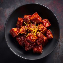 Servez ce tofu nappé d’une belle couche de sauce, garni de zestes d’orange, d’oignons nouveaux ou d’herbes fraîches. Il s’accompagne à merveille d’un riz jasmin, de nouilles de riz ou même d’un simple riz sauté aux légumes. Un plat solaire, intense et délicieusement original.